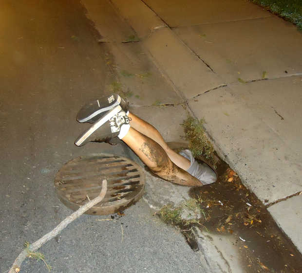 画像は、酒に酔い排水溝に頭を突っ込んだまま